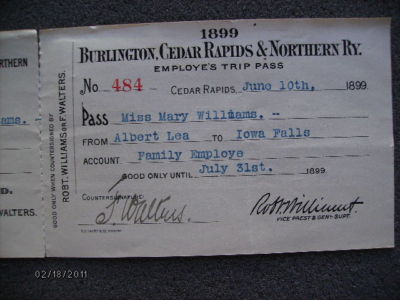 BURLINGTON CEDAR RAPIDS & NORTHERN RAILWAY 1899 PASS