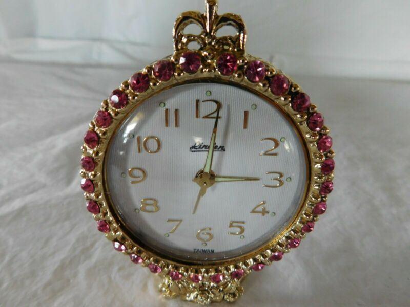 antique wind up alarm clock Linden pink rhinestones Hollywood Regency works old