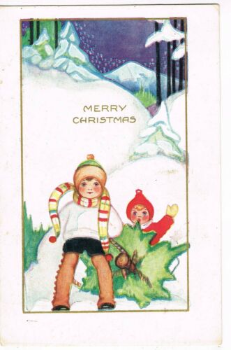 ANTIQUE CHRISTMAS Postcard (WHITNEY MADE) CHILDREN PULLING XMAS TREE IN SNOW