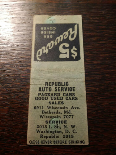 Title (ebay affiliate link): Vintage Matchbook Cover Match: Republic Auto Packard Cars, Bethesda, MD L