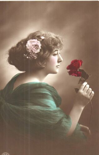VINTAGE GLAMOUR postcard: PRETTY LADY WITH A ROSE