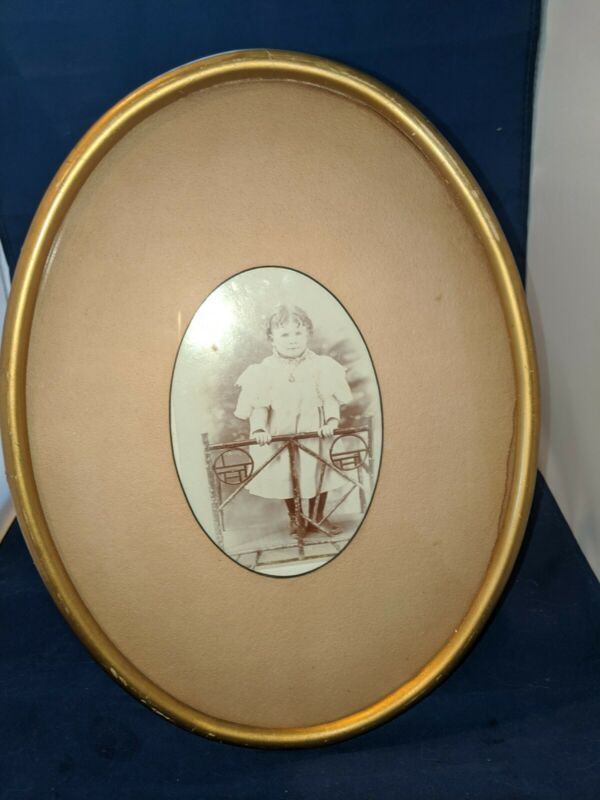 Vintage Oval Wooden Frame with photo of young girl 12 1/2 X 9 1/2"