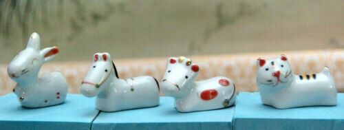 Japanese Porcelain Figurines Wara-uma, Akabeko, Maneki-neko, and Tama usagi