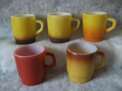 Title (ebay affiliate link): Lot of 5 VTG Fire-King Yellow Brown Cups Mugs Stacking Stackable