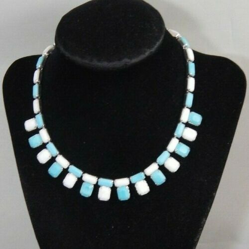 Vintage Signed Weiss Blue & White Milk Glass Baguette Choker Collar Necklace 15"