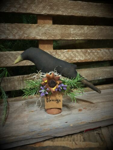 *Primitive CROW W/FLOWERS BOBBIN FABRIC HANDMADE Country old rusty doll*