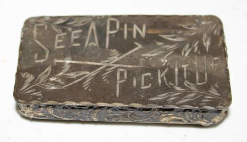ANTIQUE Trinket Box SEE A PIN PICK IT UP Silver Plate VICTORIAN