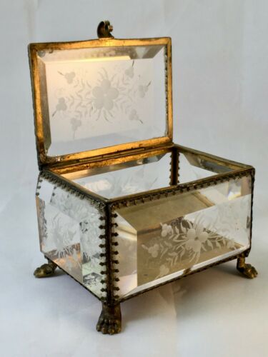 Antique Victorian Jewelry Casket Box Beveled Glass Lion''s Feet