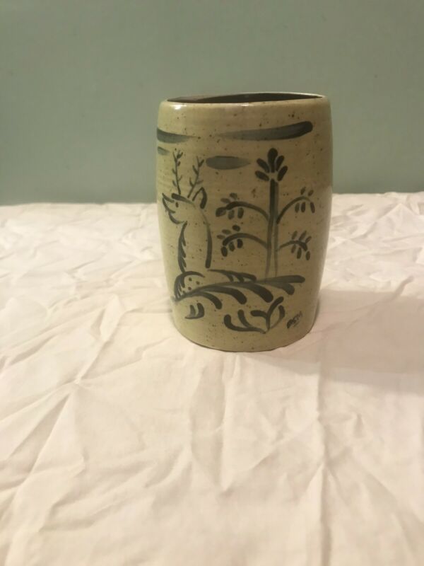 Title (ebay affiliate link): Vintage Blue Decorated Deer & Tree Design Small Crock / Brown Inside