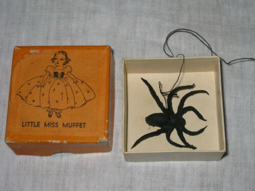 Title (ebay affiliate link): ANTIQUE TOY, LITTLE MISS MOFFET, NOVELTY RUBBER SPIDER IN BOX WITH CUTE GRAPIC