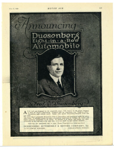 Title (ebay affiliate link): 1920 Duesenberg Eight in Row Automobile Ad: Fred Duesenberg Pic, Indianapolis IN