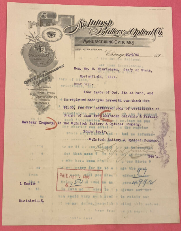 McIntosh Battery & Optical Co Chicago 1892 Letterhead Microscopes Telescopes