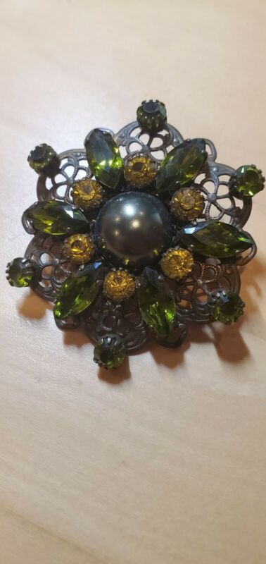 Title (ebay affiliate link): Dimitriadis Vintage Brooch Pin 6 Point Yellow Green Brass Rhimestone Old Rare