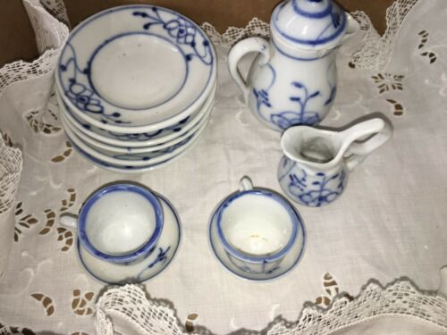 Antique Doll Miniature Old Blue Onion Pitcher, Creamer, Set of Plates Germany