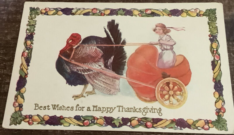 Title (ebay affiliate link): Vintage Thanksgiving Day Postcard Turkey Pulling Pumpkin Chariot Girl
