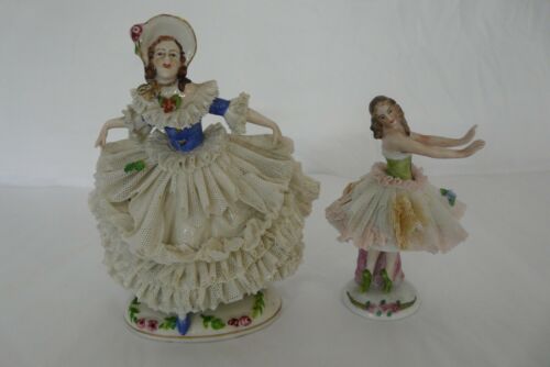 2 Antique Vintage DRESDEN Porcelain Lace LADY Figurines - Damaged