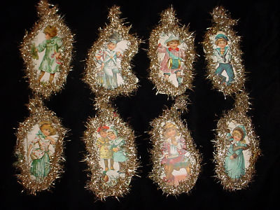 Title (ebay affiliate link): 10 ANTIQUE VICTORIAN SCRAP TINSEL CHRISTMAS ORNAMENTS