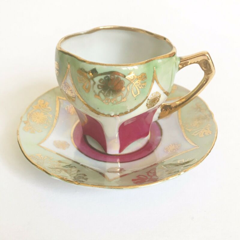 Title (ebay affiliate link): Vintage German Germany Pink Green Gold Lustre Demitasse Cup Saucer Trinket Dish