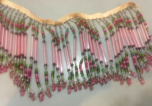 Vintage antique Czech glass tube beaded lamp shade fringe 20" pinks