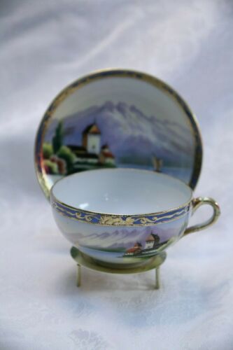 JAPANESE HANDPAINTED TEACUP AND SAUCER W VIBRANT COLORED TOWER GOLD GILDING