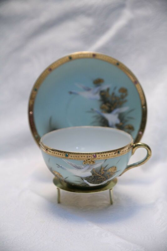 Title (ebay affiliate link): JAPANESE HANDPAINTED TEACUP AND SAUCER W WHITE CRANES, GOLD GILDING, JEWELS