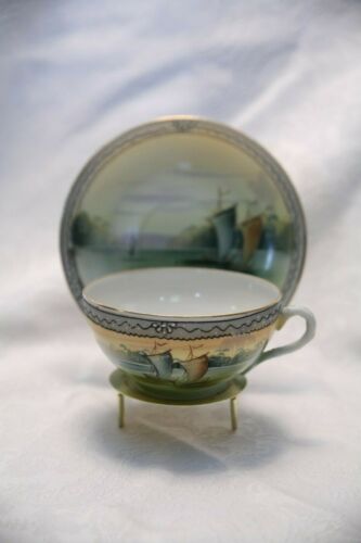 Title (ebay affiliate link): JAPANESE HANDPAINTED TEACUP AND SAUCER W 2 SAILBOATS GREEN BROWN BLUE COLORS