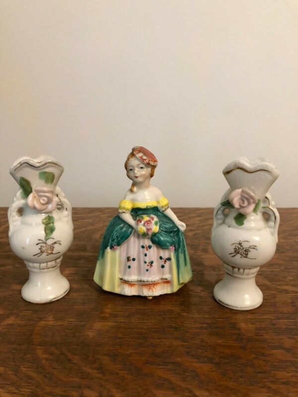 Title (ebay affiliate link): Vintage Ceramic Figurine of Woman Made in Occupied Japan & 2 Mini Vases
