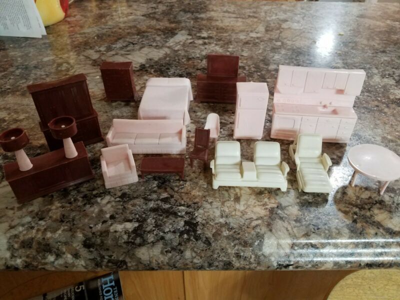 Title (ebay affiliate link): 17 Pieces Of Kitchen Plastic Doll House Furniture pink brown vintage