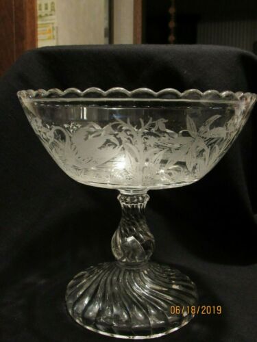 VINTAGE ANTIQUE GLASS COMPOTE DECORATED WITH FROSTED SWANS
