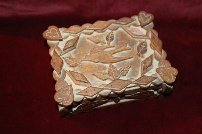 Superb Antique TRAMP ART Ditty Box ~ Hearts~ Dove~ Leaves~ Diamonds Circa 1890