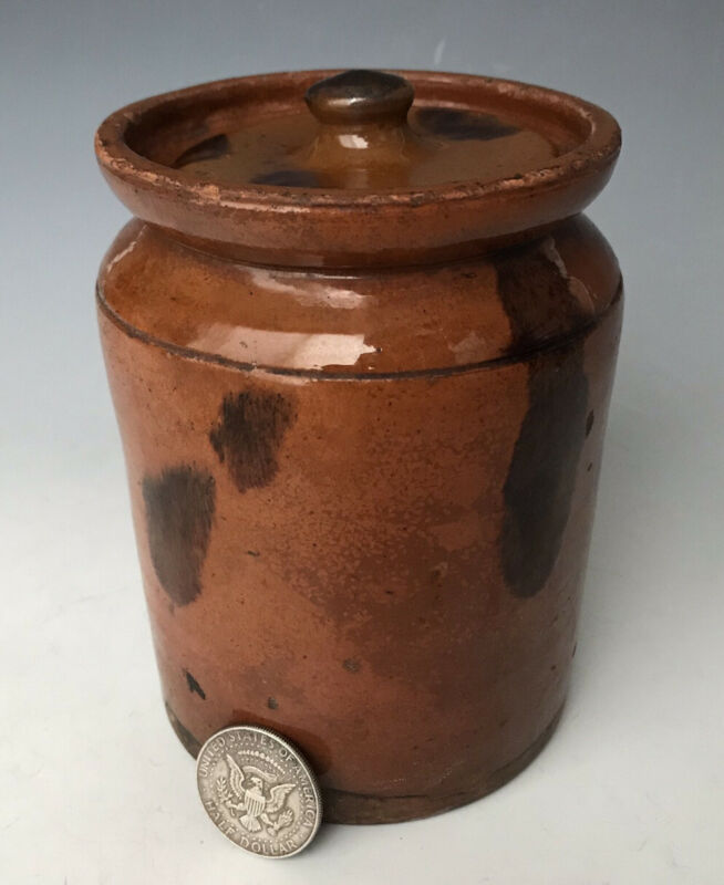 Title (ebay affiliate link): Antique Redware: Miniature Pantry Jar w/ Manganese & Lid! att Norwalk CT, c.1840