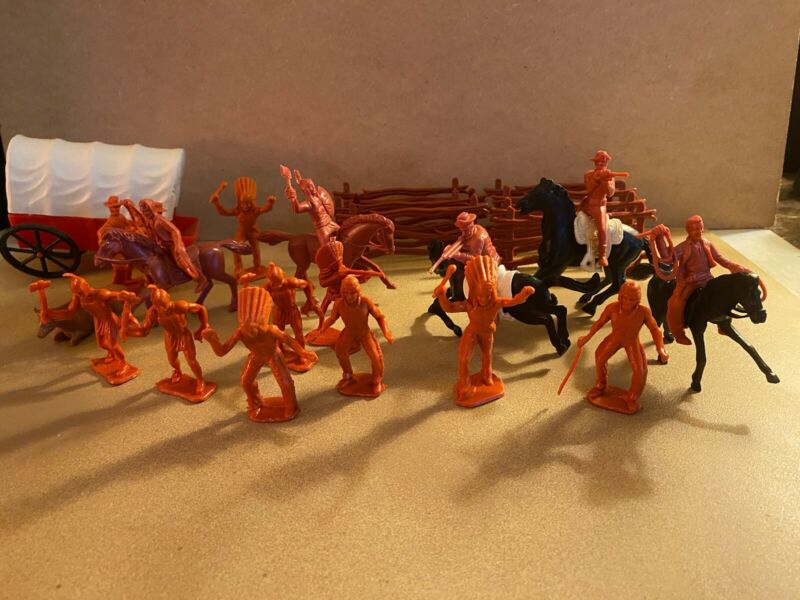 Title (ebay affiliate link): MPC - 6 Cowboys, 9 Indians, 8 fence sections, partial covered wagon, cow