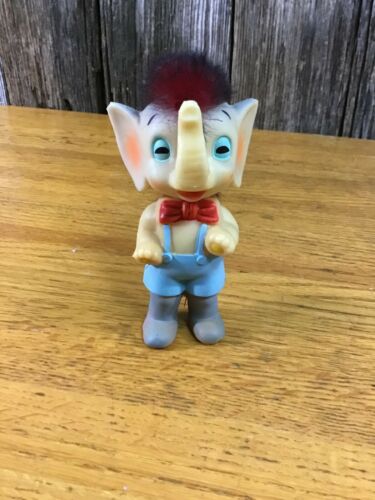 Title (ebay affiliate link): Vintage rubber squeek Japan toy elephant in overalls with Mohawk hair