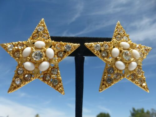 Vintage Large Gold Tone Milk Glass RHINESTONE STAR EARRINGS Clip on Gorgeous