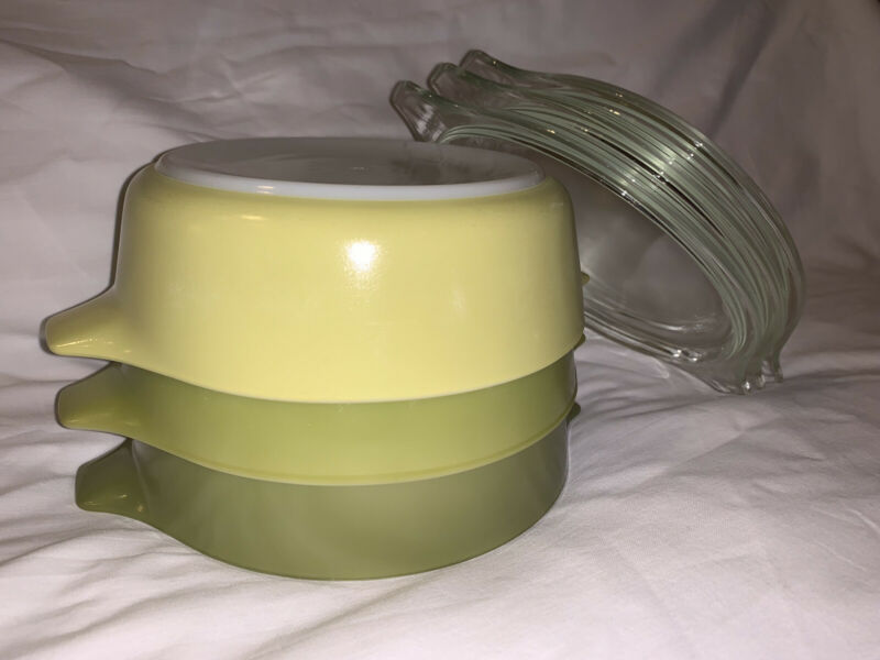 Pyrex Verde Spring Green Bowl Set with Lids 471 472 473 470-C Cinderella Handles