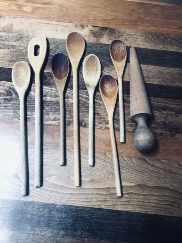 Title (ebay affiliate link): Vintage (8) Antique Primitive Wooden Kitchen Utensils~ (7) Spoons & (1) Masher~