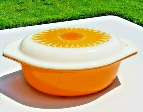 Title (ebay affiliate link): Vintage Pyrex 043 Bright Orange 1-1/2 Quart Casserole Dish WITH Flower Cover!
