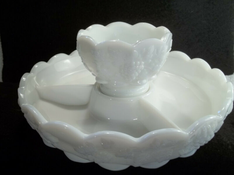 Title (ebay affiliate link): VTG WESTMORLAND MILK GLASS,3-SECTION SERVING DISH W/CNTR BOWL,GRAPES/LEAVES PATT