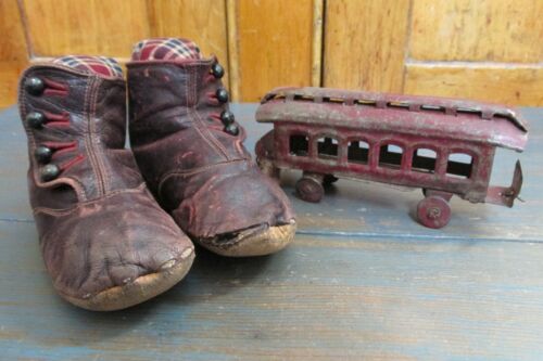 Child''s Antique Cordovan Button Shoes, Metal Train Car, Country, Farm Primitive