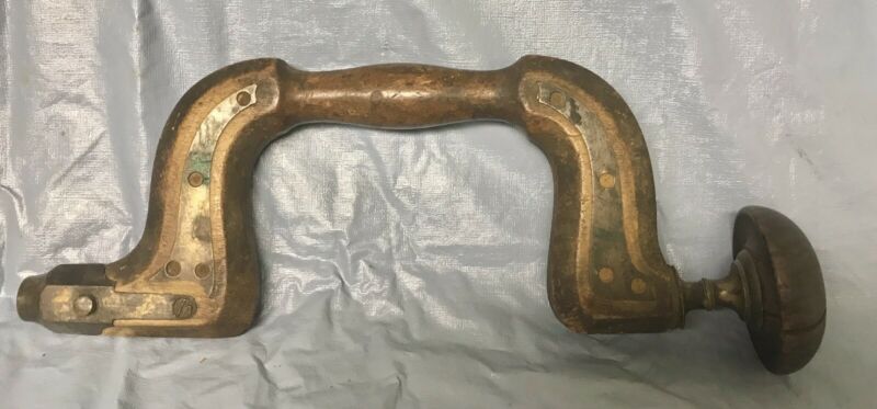 Antique Wood & Brass Bit Brace Hand Drill Auger Vintage Primitive Tool