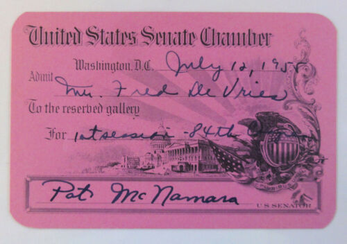 Title (ebay affiliate link): REDUCED! VINTAGE ORIGINAL 1955 SENATE CHAMBER VISITOR PASS - PAT McNAMARA, MI