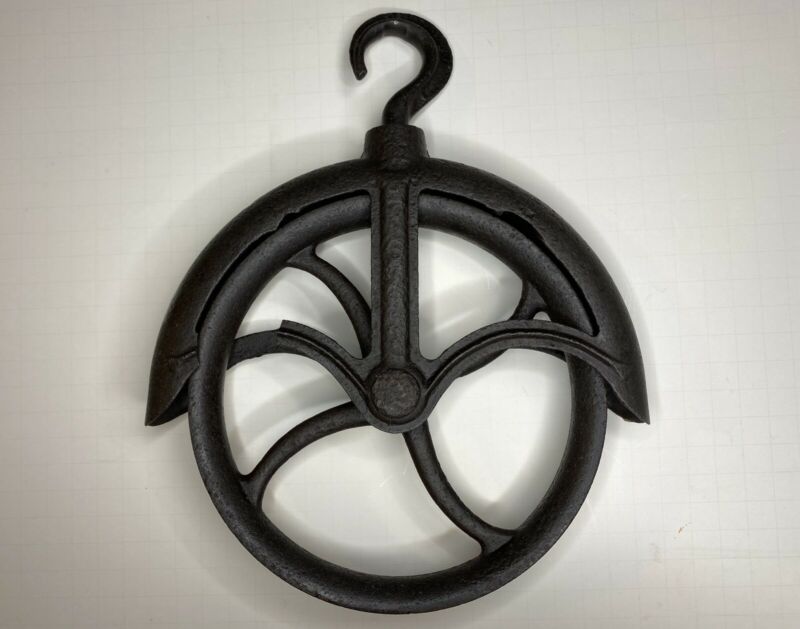 Title (ebay affiliate link): Vtg Antique Cast Iron Well Pulley Farm Barn Tool Primitive Hay Trolley Transit