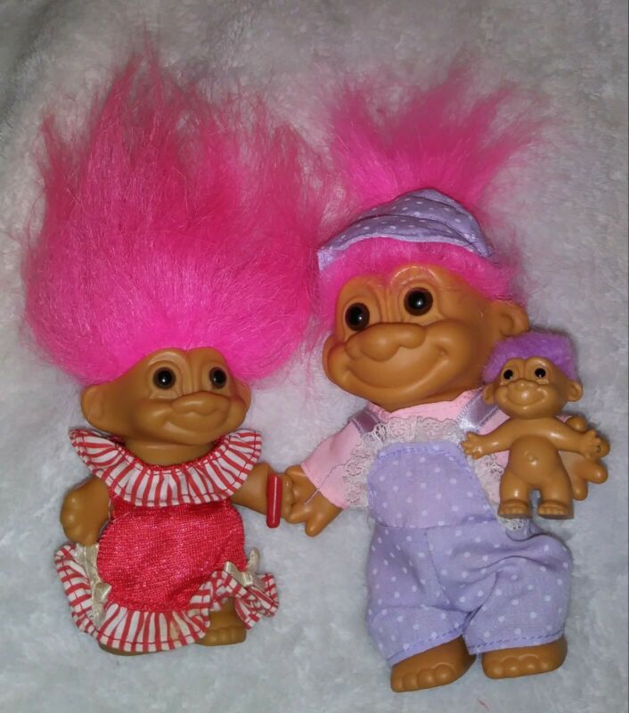 Title (ebay affiliate link): Lot 3 Vintage Troll Dolls 2 SISTERS & Their DOLL Bright pink Hair & Purple
