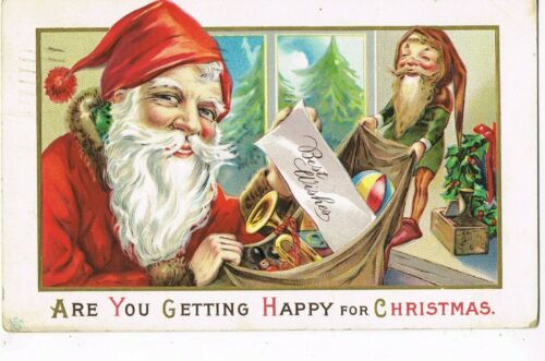 ANTIQUE CHRISTMAS Postcard SANTA, ELF, "ARE YOU GETTING HAPPY FOR CHRISTMAS"