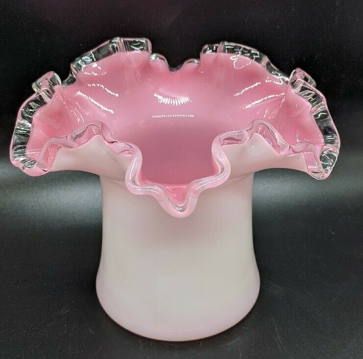 Vintage Fenton Milk Glass Peach Blow Pink Silver Crest 5" Ruffled Crimped Vase