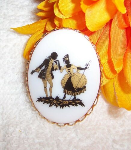 Title (ebay affiliate link): VINTAGE CAMEO BROOCH MILK GLASS SERENADE COURTING COUPLE HAND PAINTED GOLD GILT