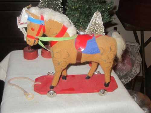 Title (ebay affiliate link): Antique/Vintage Brown Felt Pull Toy Horse W. Germany Wood Base/Metal Wheels #3