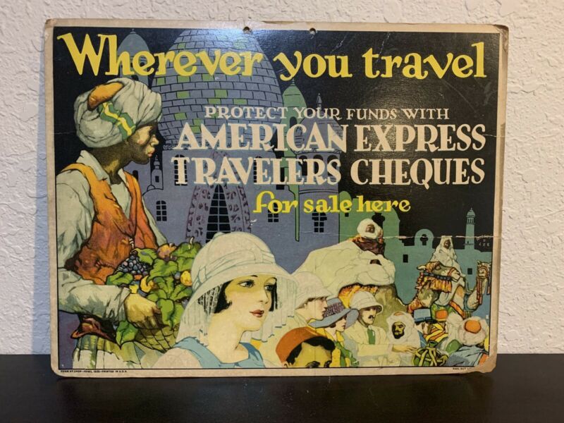 Title (ebay affiliate link): American Express Travelers Cheques Cardboard Sign, Middle East. April 1926