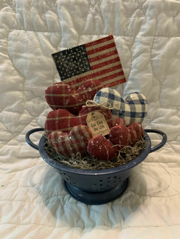 Primitive Americana Vintage Strainer Gathering Flag Homespun Hearts God Bless