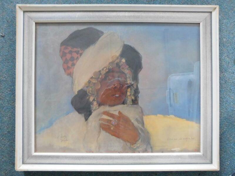 Beautiful Vintage 1950s? Framed Print Pastel Drawing Arabesque African Maiden
